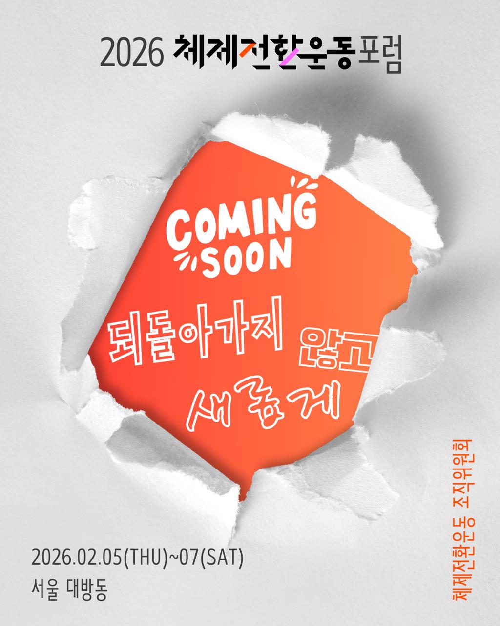 2026 체제전환운동 포럼 👀 🍀 2026년 2월 5일(목)~7일(토) 3일간 🌱 서울 대방동 🌸 참가 신청: 1월 13일(화)부터 🌲 문의: go.systemchange@gmail.com 🍉 자세한 내용은 체제전환운동 조직위원회 홈페이지 참조 |