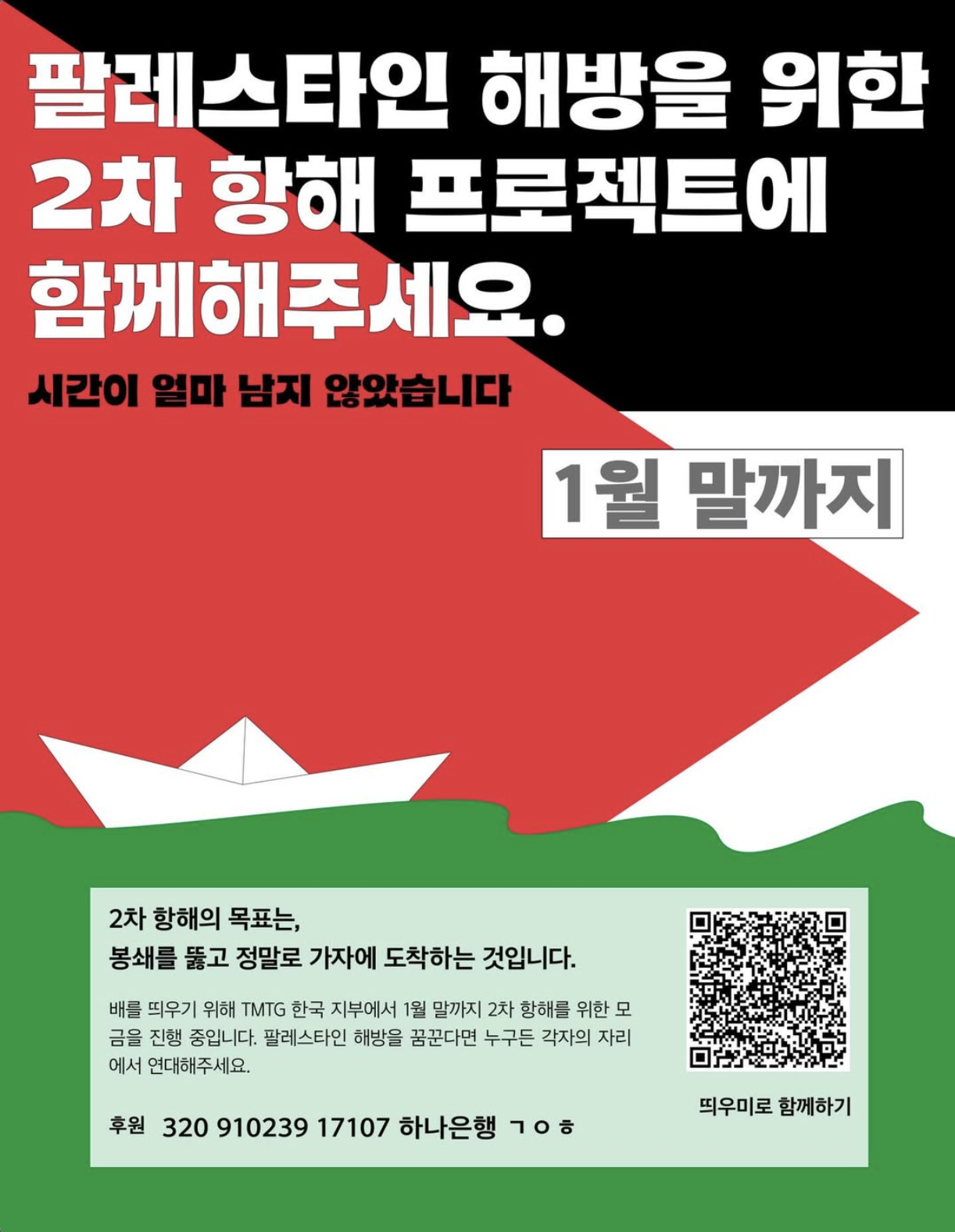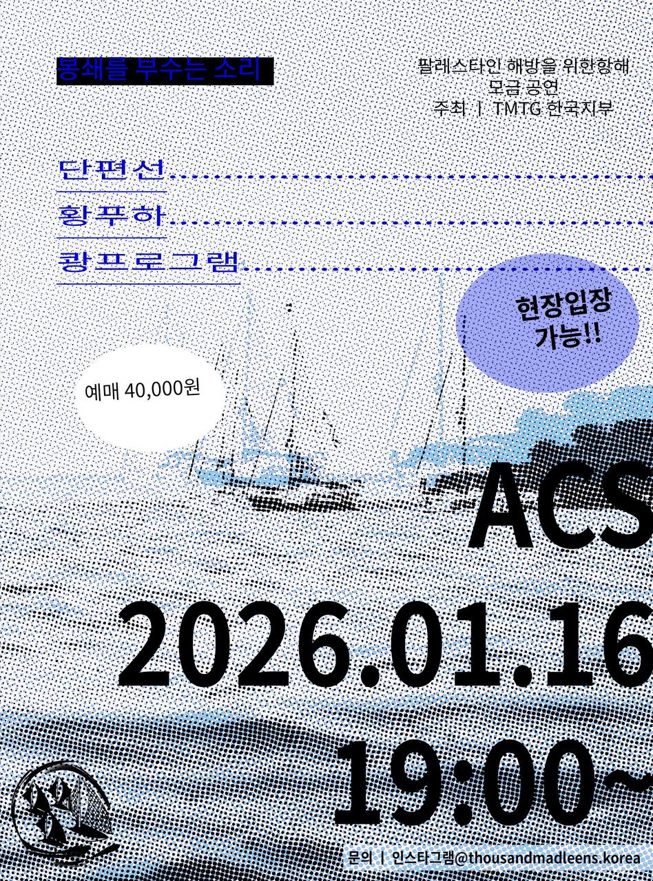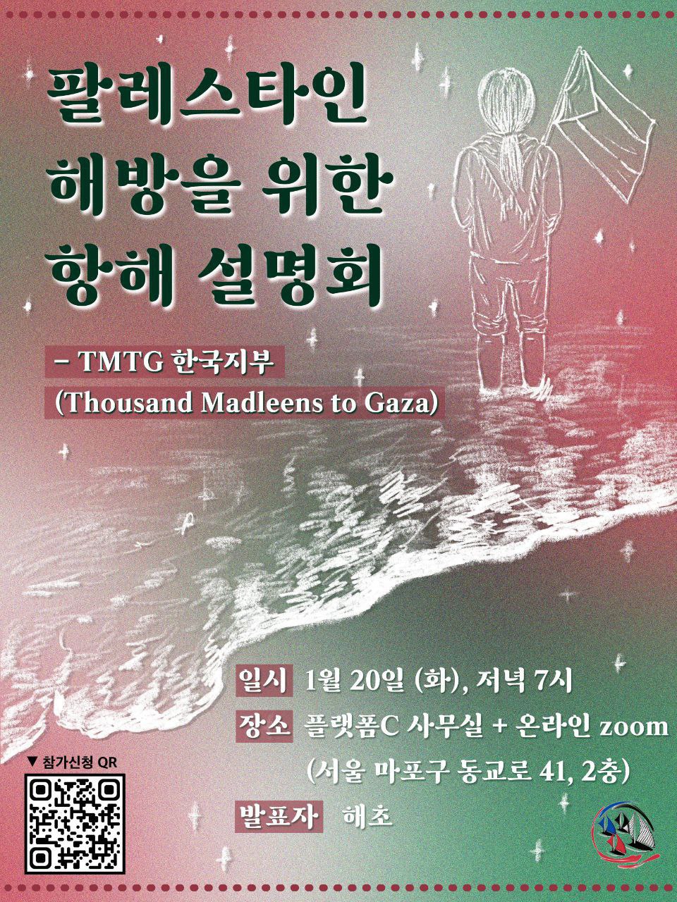 TMTG(Thousand Madleens To Gaza, 가자로 향하는 천개의 매들린호)는 가자지구로 향하는 항해를 통해 이스라엘의 가자 봉쇄에 대항하는 국제 시민연합입니다. 전세계 각국에 20여 개의 대표단이 활동하고 있으며 2025년 12월 9일 한국 지부가 출범했습니다. 지난 10월 가자로 가는 첫번째 항해가 시도되었으며 한국 활동가 해초가 참여했다가 이스라엘에 나포되어 고초를 겪기도 하였습니다. 봉쇄를 부수는 것을 목표로 하는 항해는 계속됩니다. TMTG한국지부는 올해 가자지구로 향하는 항해를 위한 선박 구입, 구호물자 구입, 장비 구입 등에 사용될 비용 3천 5백만원을 목표로 모금운동을 하고 있습니다.