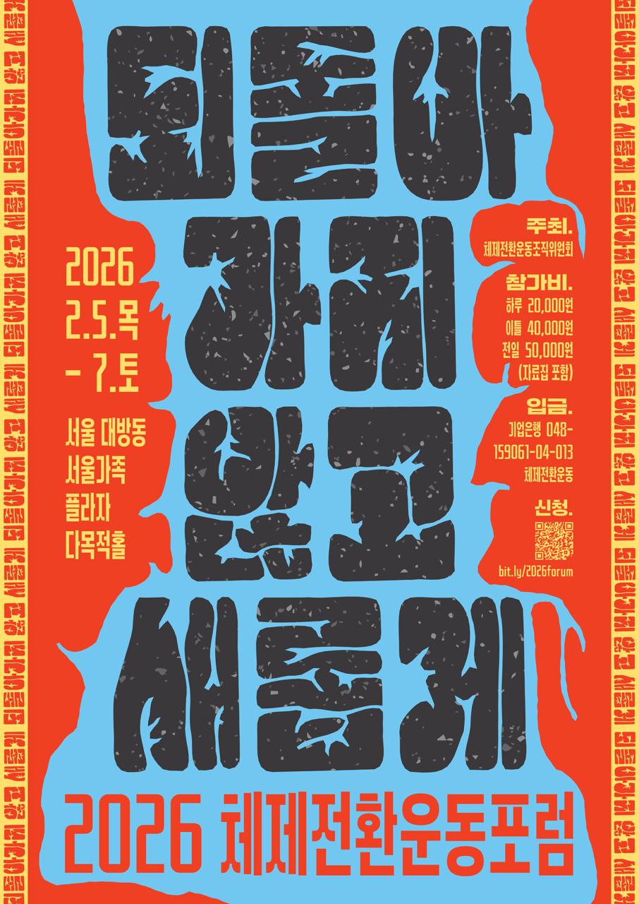 🔆 서로 다른 운동의 통찰과 도전을 공동의 전망으로 만들기 위해 올해도 체제전환운동포럼이 열립니다. 2월 5~7일 사흘간 서울 대방동에서 치열한 토론과 뜨거운 상상을 나누고 모읍시다.