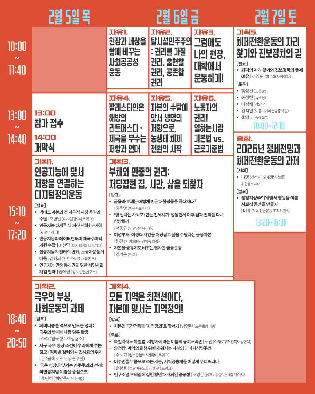 🍉 극우 세력화에 맞선 대안, 부채와 민중의 권리, 지역소멸 담론에 맞선 운동, 진보정치, 인공지능 담론 비판 등 지금 시기 사회운동에 필요한 쟁점들을 다루고, 사회공공성과 탈시설 민주주의, 학생운동, 팔레스타인 연대, 가짜3.3% 계약 노동자들의 권리, 농생태 체제전환 등 6개의 자유세션이 열립니다. 또, 종합세션에서의 정세분석과 전망을 통해 사회운동 공동의 과제를 만들고자 합니다.
