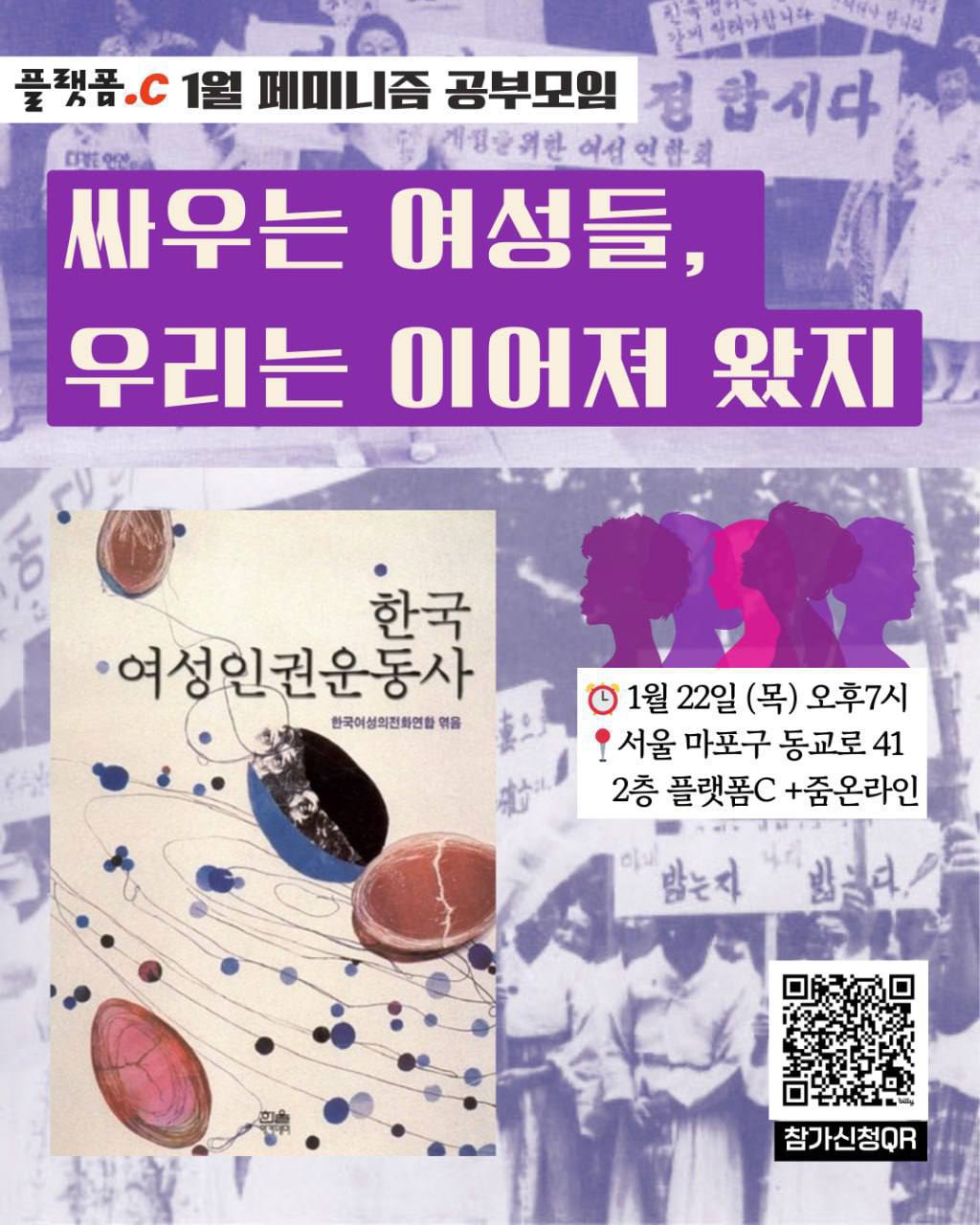 1월 플랫폼c 페미니즘 공부모임에서는 『한국여성인권운동사』를 함께 읽습니다. 이 책은 1980~90년대 한국에서 여성이 사람답게 살 권리를 위해 힘써온 사회운동의 역사를 다룹니다. 반성폭력, 아내구타추방, 일본군 '위안부', 매춘여성, 기지촌여성, 레즈비언, 장애여성 등 여성인권을 위해 싸워온 수많은 사람들이 있습니다. 한국 페미니스트들이 세상을 어떻게 바꿔 왔는지 궁금한 분들, 이를 통해 힘을 얻고 싶은 분들은 오셔서 함께 이야기 나눠봐요!