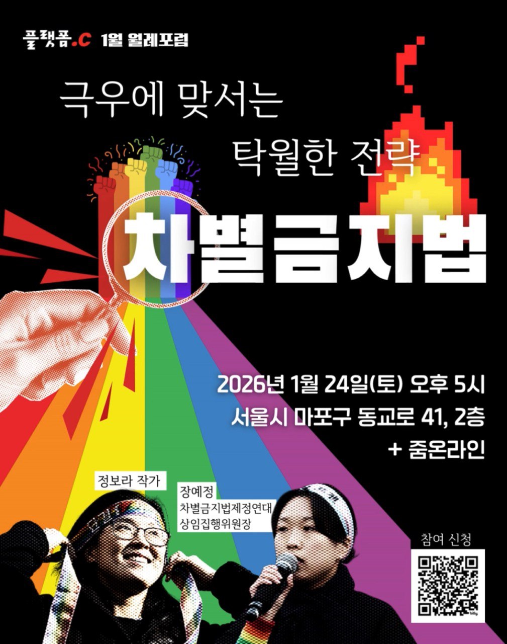 혐오정치가 일상을 침투해오고 있는 지금, 차별금지법은 더 이상 미룰 수 없는 민주주의의 과제입니다. 극우는 사람들이 겪는 불안을 여성, 성소수자, 이주민, 장애인의 존재를 탓하며 결집하기 때문입니다. 플랫폼C 1월 월례포럼에서는 혐오에 맞서는 전략으로서 차별금지법에 대한 이야기를 나눕니다. 차별과 배제의 정치를 넘어 모두가 존엄하고 평등한 세상을 만들고 싶은 분들 모두 초대합니다!
