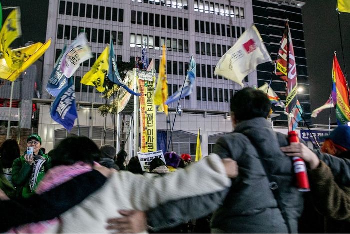 2025년 12월 10일 저녁 7시 서울 보신각 앞에서 78개의 사회운동 단체와 진보정당이 함께한 ‘가자, 평등으로! 12.10 민중의 행진’이 열렸습니다. 1년 전 비상계엄을 선포했던 윤석열뿐 아니라 민중의 삶을 억압하는 불평등을 끝내고 평등한 사회로 나아가고자 하는 사람들이 광장에 다시 모인 것입니다. 윤석열 파면 이후 새 정부가 들어섰지만, 광장에서 함께 외쳤던 새 세상은 아직 도착하지 않았습니다. 참가자들은 윤석열 퇴진을 넘어 그를 대통령으로 만들었던 구조 자체를 바꾸기 위해 다시 거리로 나섰습니다. “차별금지법 있는 나라, 노동이 존엄한 나라, 기후정의 당연한 나라, 공공성 든든한 나라, 진보 정치 빛나는 나라”를 만들겠다는 다짐 속에 700여 명의 시민들이 광장을 채웠습니다. |